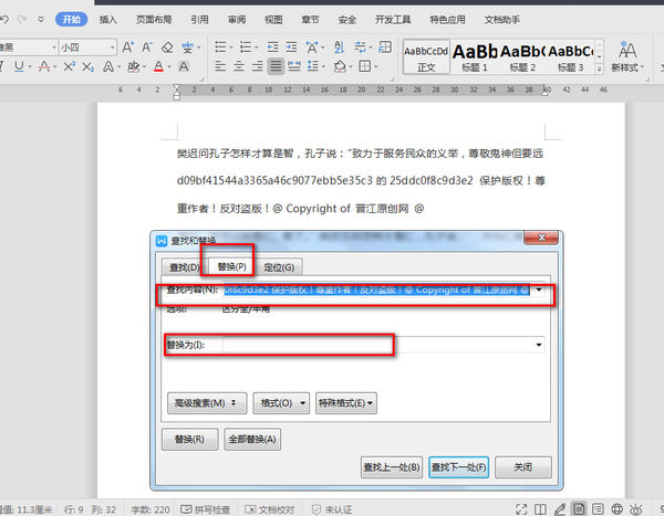 4、在“查找和替换”中选择“替换”,在“查找内容”后面将刚刚复制的内容粘贴进去,“替换”的位置不需要填入内容。