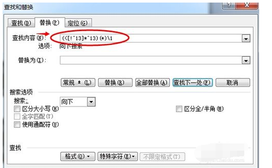 3.标单击【查找内容】文本框,输入“(<[!^13]*^13)(*)\1”,特别提醒注意输入的内容是双引号中的内容,不包括双引号,否则会报错查找不到。