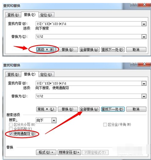 4.然后点击【替换为】文本框,输入"\1\2" ,单击勾选下面【使用通配符】前的复选框打勾,如果找不到这个复选框,就是出于简略窗口模式,可以点击窗口下方的【高级】按钮打开。