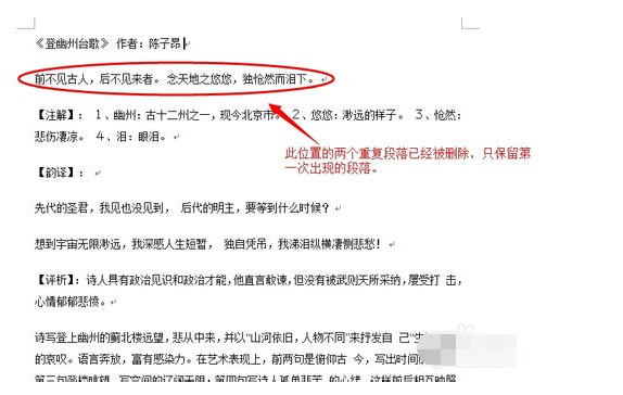 6.点击 确定 按钮后关闭窗口,回到文档正文查看,已经成功删除文档重复段落。
