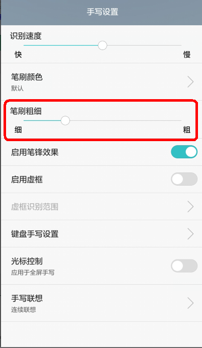 2、注意点击华为输入法一栏右边的小圆圈——手写设置——即可调整手写的速度、颜色、和笔画粗细。这里特别说明一下,下面一栏是“启用笔锋效果”,默认是打开。如果不把它设置在关闭状态,则上面的笔画粗细调整无效。如图: