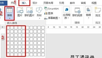 输入标题“员工通讯录”,设置为“黑体、三号、居中”。回车后,执行“插入”——“表格”,选取5列多行。