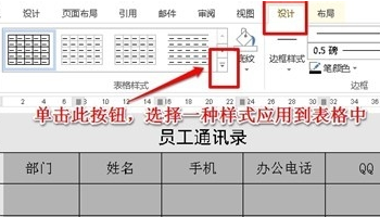 3、选中表格,在“设计”选项卡中,单击图示的下拉按钮,选择一种表格样式,应用到表格中。