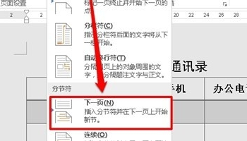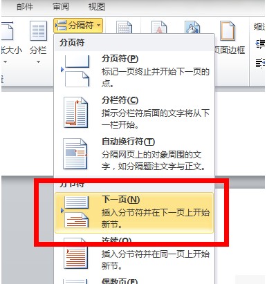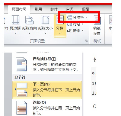 2、在上一页插入分隔符:选择菜单“页面布局”→“分隔符”→“下一页”。