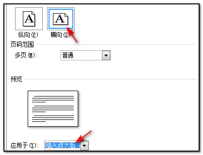 4、接着在此页面内点击“横向”,然后再在下方的“应用于”右侧的点击“插入点以后”,然后就完成了。