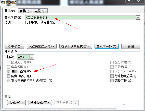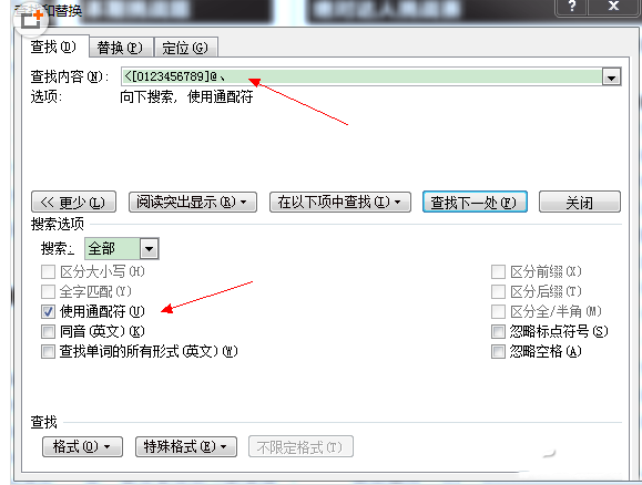 2、打开Word的查找和替换功能,在查找中输入查找内容为“<[0123456789]@、”,