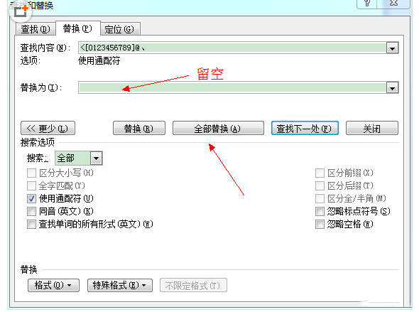 6、切换到“替换”选项卡,替换内容要保持空白状态,然后点击全部替换。此时,原来错序的手工编号已经完全被替换成新的自动编号了,而且以后如有调整,序号也会自动调整改变。