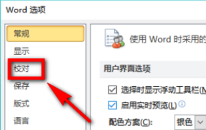 3、这时就进入到了word选项页面了,在该页面中左侧还是菜单栏,在菜单栏中点击【校对】选项
