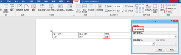选择最右边单元格,找到WORD中的“公式”命令并执行,然后选择选择=SUM(LEFT)。