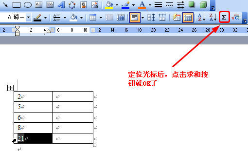 假设求2+5+6+8的和,先将它们分别放到五行表格里的同一列,然后将光标定位在最后一行的那一数字列上,点击∑,自动就出现结果了