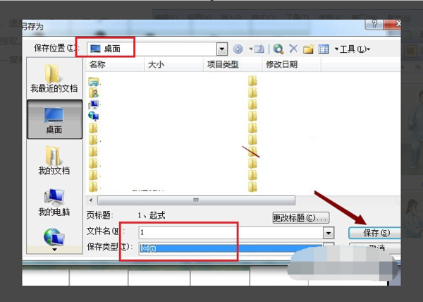 4、保存位置设置为桌面,文件名为1,保存类型为网页单击保存。