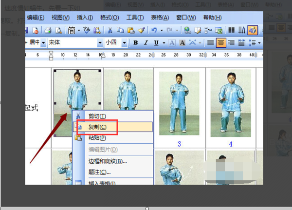 1、打开word文档,选中一张图片,右击---复制。