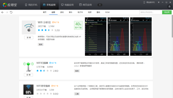 通过应用宝等平台下载一个wifi信号检测仪软件