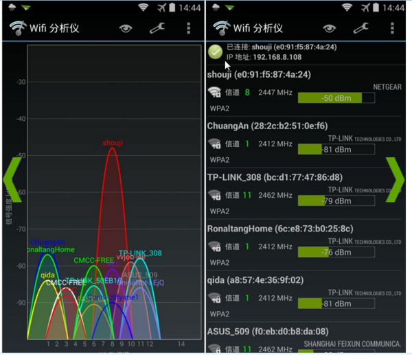 WIFI分析仪可以显示周围的Wi-Fi信道使用情况,帮助无线路由选择一个相对空闲的信道以提高连接质量。