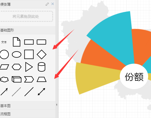 在画布的四周有很多的工具栏,这些在绘制的过程中都是可以使用的,首先,将中心主题进行确立,沿着中心主题进行节点的添加,点击左侧【基础图形】直接用鼠标将图形拖曳至右边画布需要的位置即可;