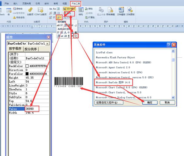 鼠标右击工具栏,打开“控制工具箱”工具栏。单击“其他控件”按钮,在命令选项列表中选择“Microsoft Barcode Control 9.0”,这样即可在Word文档中插入条形码。1. 设置条形码的样式方法鼠标右击插入的条形码,在弹出的菜单中依次选择“Microsoft Barcode Control 9.0对象→属性”命令,在显示的“属性设置”界面中进行相应的设置即可。2. 设置条形码数字方法鼠标右击插入的条形码,选择“属性”命令,显示“条形码属性”界面,在Value值中输入需要的条形码数字,将文档保存后退出即可。