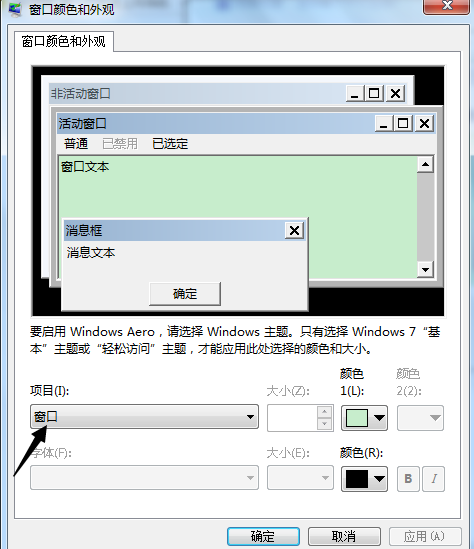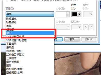 3、在随后弹出的窗口颜色外观对话框中的”项目“里选择 第五项的”窗口“。