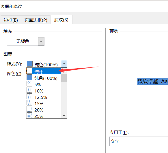 3、切换到“底纹”选项卡,点击“填充”旁边的小三角形,选择“没有颜色”或“无”。