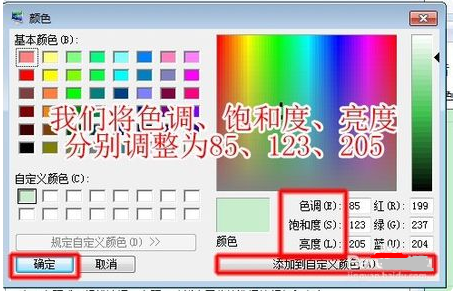 【4】将色调改为:80。饱和度:120。亮度:205→添加到自定义颜色→在自定义颜色选定该颜色,应用确定即可。