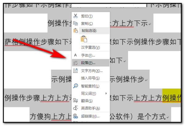 2、然后单击鼠标右键,选择”段落“选项。