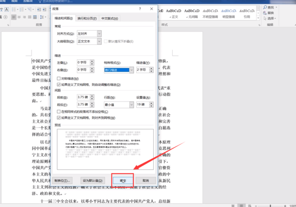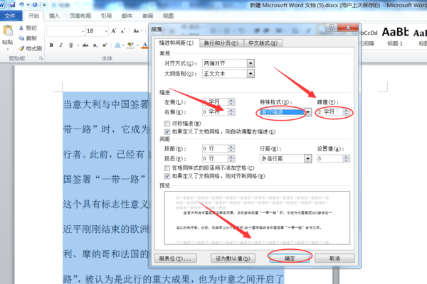 5、特殊格式中选择首行缩进,度量值输入2,点击确定。