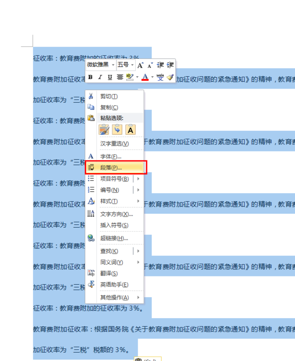 1、打开需要操作的WORD文档,选中相关段落文本,点击鼠标右键选择“段落”。