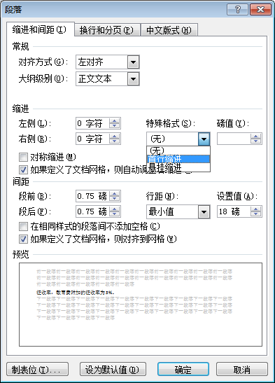 4、在特殊格式里面点击下拉菜单,可以看到有一个首行缩进,点击选中这个选项,并在后面的度量值选择2字符。