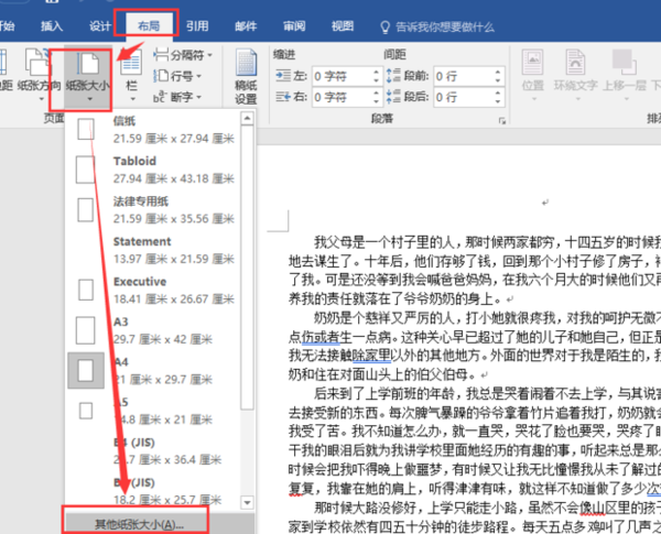 4.选择菜单栏的“布局”,选择“纸张大小”,选择“其他页面大小”;