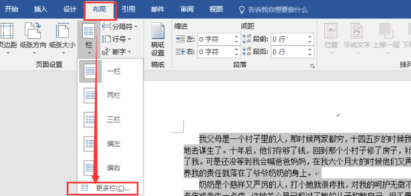在页面布局中选择“分栏”菜单,在下拉菜单中选择更多分栏。