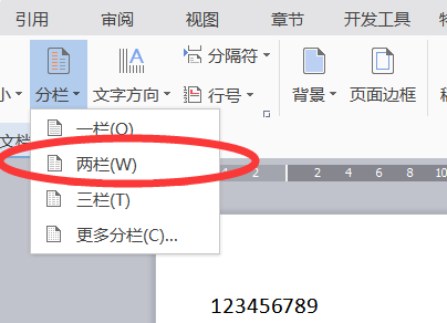 3、然后在“分栏”的下拉菜单中选择“两栏”选项。