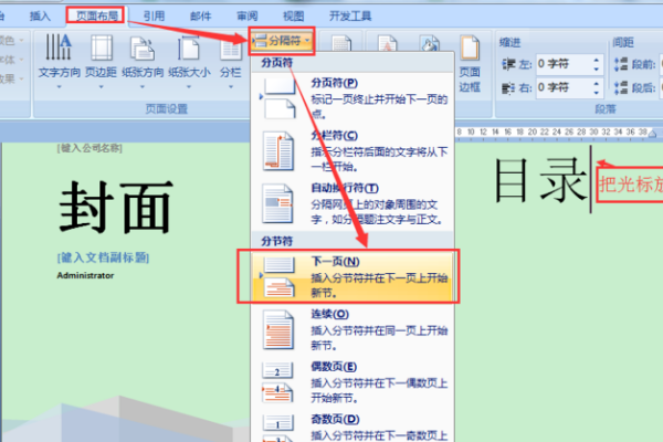 1、光标置于不插入页码封面的最后:插入——分隔符——分节符类型 ---选择下一页—确定。