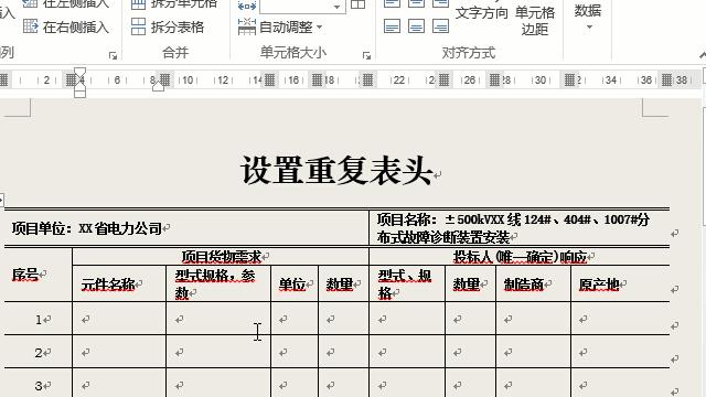 1.打开word文档,在页面视图中选中表格首页的表头(必须包括表格的第一行),单击“布局”选项卡,单击“重复标题行”命令按钮,如下图: