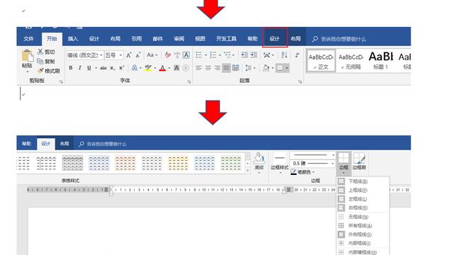 选中需要绘制斜线表头的空白单元格,继续选择“设计”——“表样式”选项组中——“边框”按钮——边框和底纹。