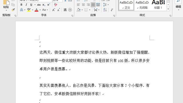 关闭设置设置之后,返回到word文档编辑界面,可以发现,所有的回车字符都不见了。当然,有人说可以使用替换功能来替换掉回车字符,不过这个方式不推荐给大家,因为你替换,种需要内容来替换或是空格或是符号,总之,增加文档不比较的符号,故本方式是较好的。