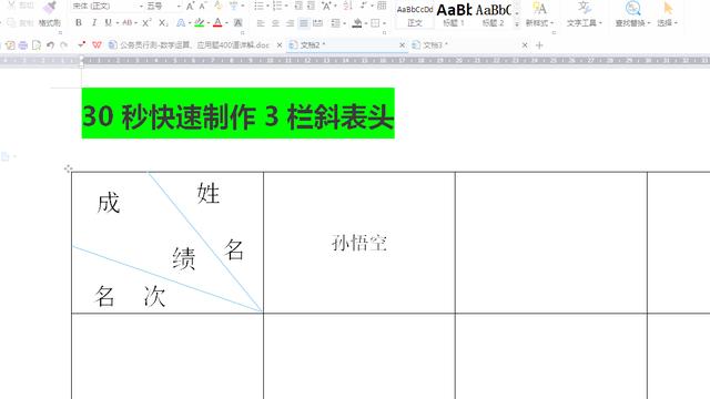 2这样,我们就把一根斜线的表头绘制好吧,然后,我们一次输入表头的文字,通过空格和回车控制到适当的位置,如图。END两根、多跟斜线的表头要绘制多跟斜线的话,这里就不能直接插入吧,只能我们手动去画了,点击导航选项卡的插入——》形状——》斜线,如图。