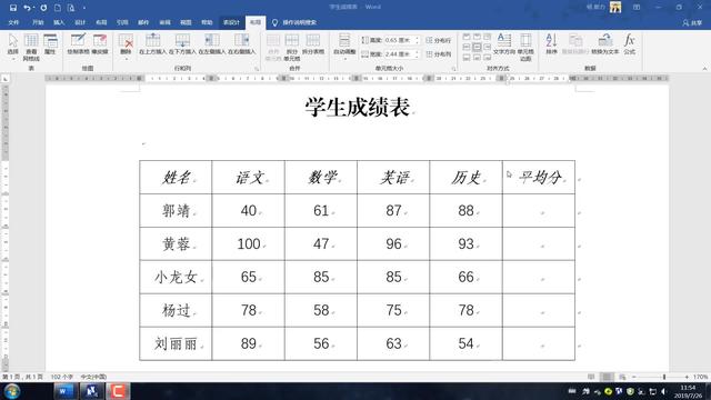 1、打开word文档,在文档输入人名、各科成绩、平均值等。