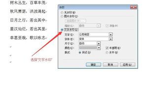 1.添加文字水印 制作好文档后,在“格式”菜单下“背景”中选择“水印”选项,选择“文字水印”,在“文字”菜单中选择水印的文字内容,也可自定义水印文字内容。