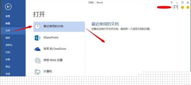 2、打开word (可以随便哪个word文档),点击左上角的文件菜单,在弹出的下拉列表中默认选中的就是打开选中,在右边可以看到最近使用的文档,可以找到在忘记没有保存的文件。