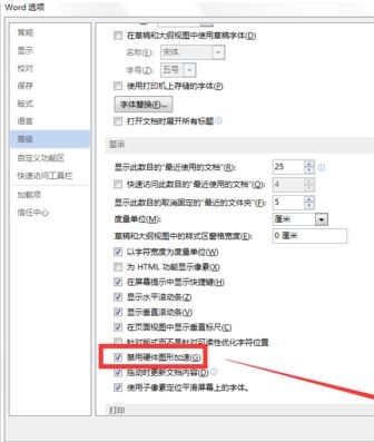 5、找到并勾选“禁用硬件图形加速”选项,点击确定并重新打开Word即可。