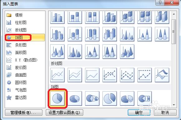 第二步:在“插入图表”窗口,选择左侧菜单中的“饼图”,并单击基本模板图,单击“确定”