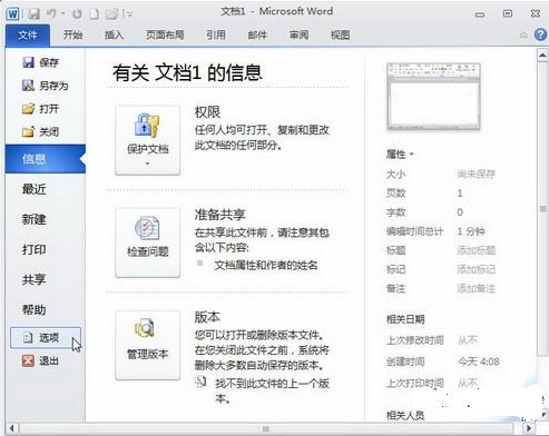 1.打开Word 2010文档窗口,依次单击“文件”→“选项”命令,如图所示。