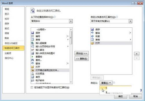 3.重复以上步骤可以向Word2010快速访问工具栏添加多个命令,依次单击“重置”→“仅重置快速访问工具栏”按钮将“快速访问工具栏”恢复到原始状态。