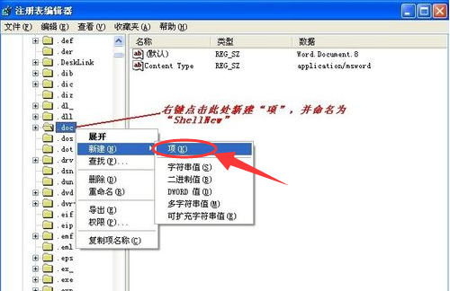 3、在“HKEY_CLASSES_ROOT”下面的子菜单里找到代表office办公软件的后缀文件夹,如Word为.doc、Excel为.xls、Powerpoint为.ppt,这里以Word为例,找到.doc文件夹后点击右键新建“项”,并命名为“ShellNew”。