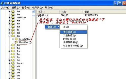4、点击新建的”ShellNew”文件,在右面的空白区域用鼠标右键点击新建“字符串值”,并命名为“NullFile”。