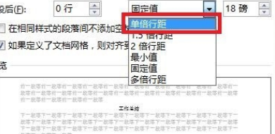 5、因此我们需要对行距进行新的设置,单击【固定值】后面的倒三角,在列表中选择【单倍行距】。