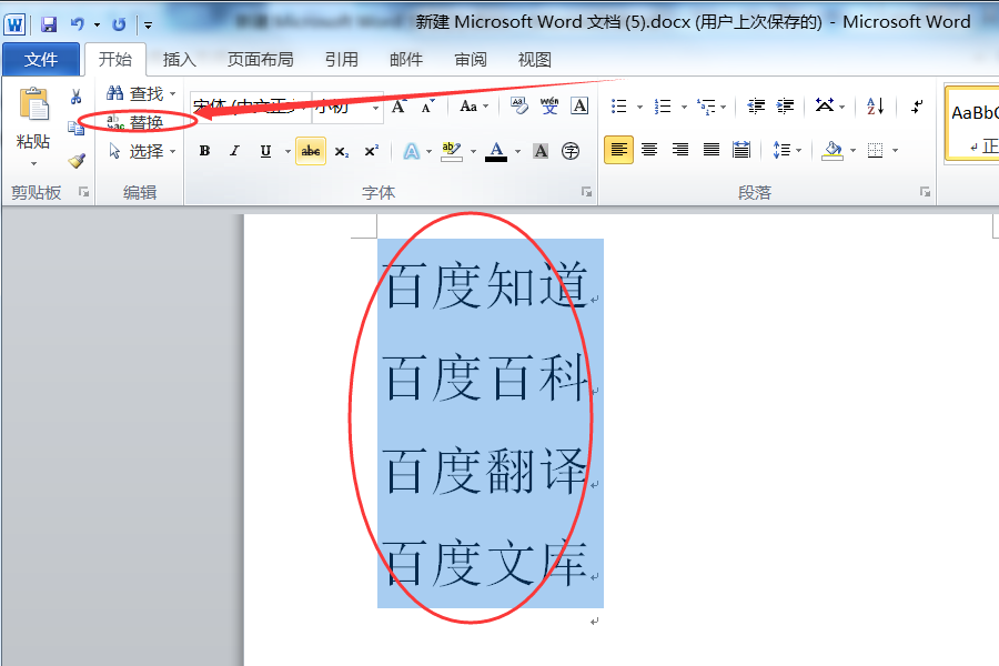 1、打开需要操作的WORD文档,选中需要替换回车符的文本,在开始选项卡中找到并点击“替换”。