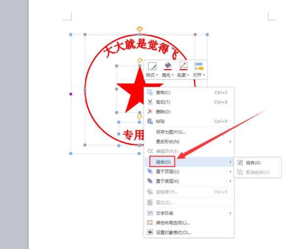 9、这样一个公章就制作完成了,但是你的公章还不能移动哦,需要将他们组合起来,选中所有的对象,在页面布局中选择组合,这样你制作的公章就可以移动了。