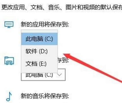 5、在打开的页面中,在“新的应用将保存到”下拉菜单中选win10软件默认安装路径为C盘以外的其他存储盘。