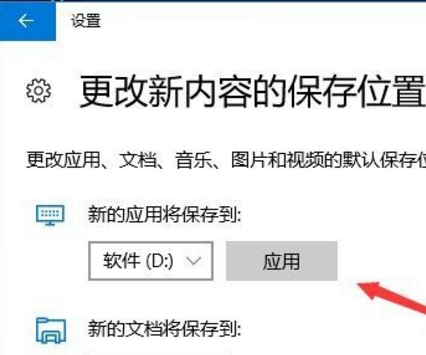 6、如图可以选择D盘,然后点击应用按钮。这样以后新的应用都将保存到修改后的D盘中,也可以保存其他存储盘,根据自己喜好。