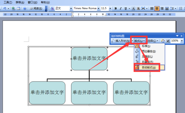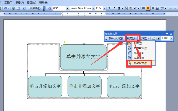 打开word文档,点击选中页面上组织结构图的任意一个需要修改大小的框架,在“组织结构图”工具栏里,点击“版式”,选择“自动版式”;